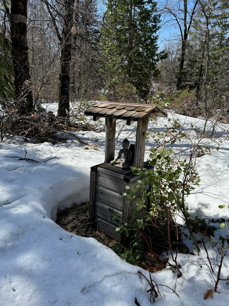 This little shrine sits at the beginning of a trail down to the medicine circle on my lovely land in the Sierras, which we call Serenity. A few weeks ago, you couldn’t see any of it! It was covered in snow. Now, spring is here, the snow is melting, and things are emerging from their underground winter existence.